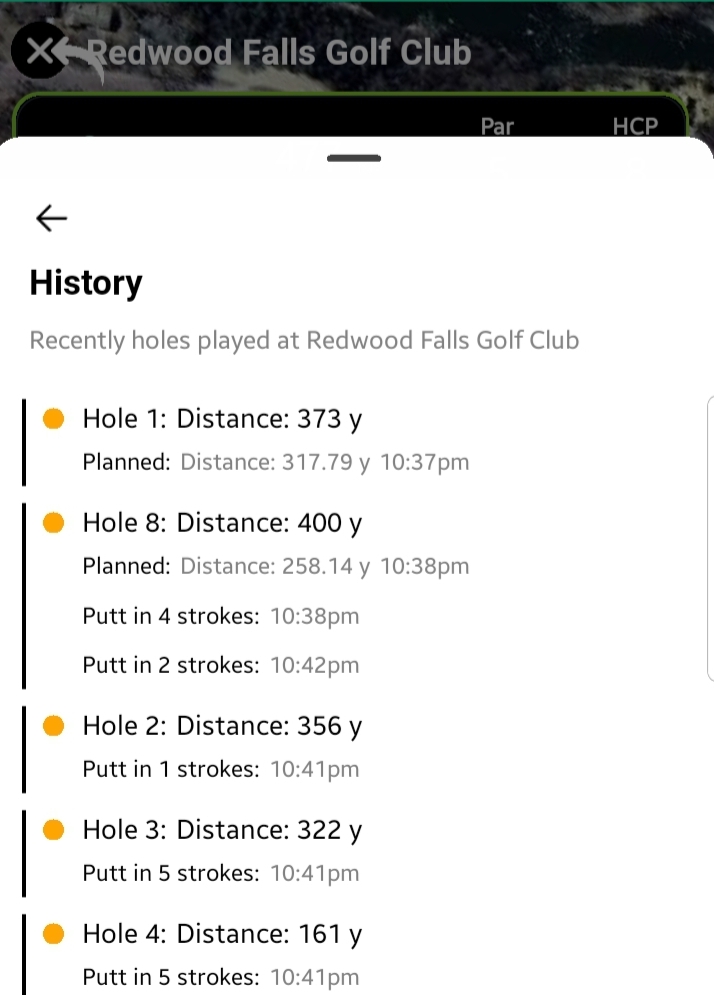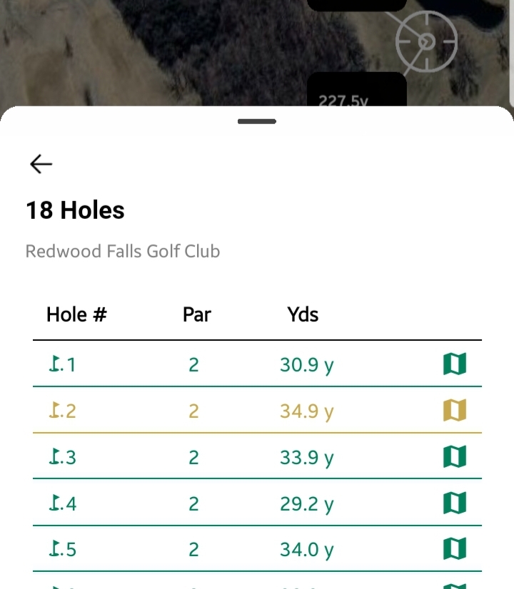Opens a bottom sheet listing all hole numbers with their distance from your current location.