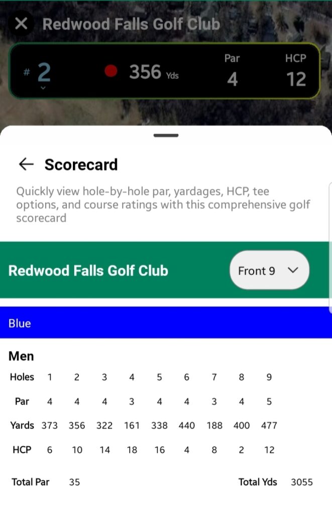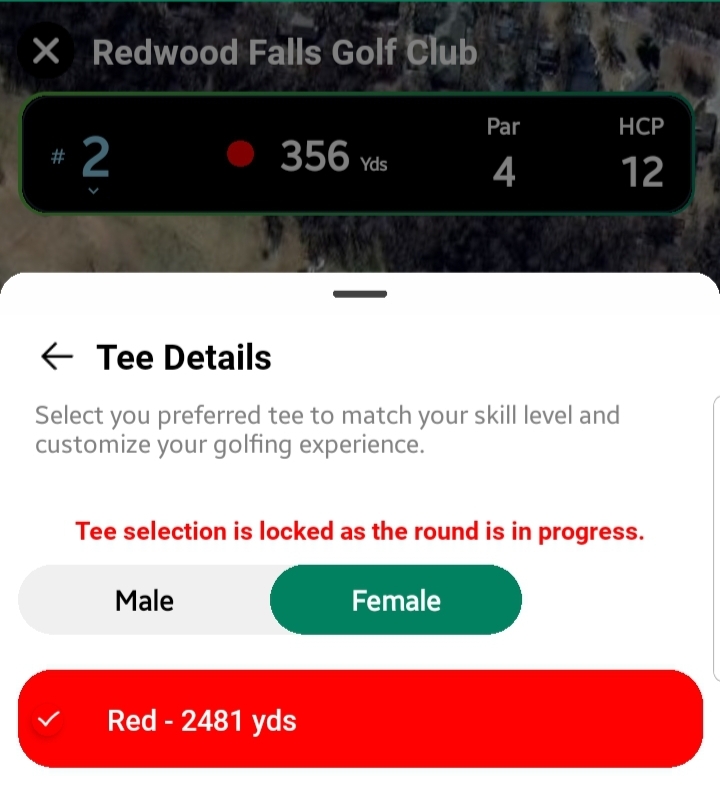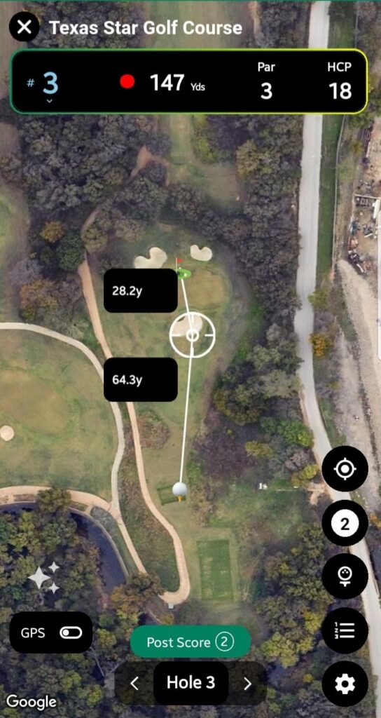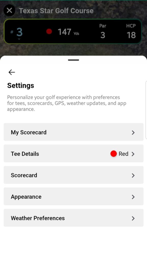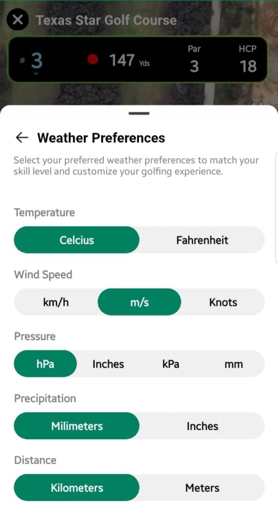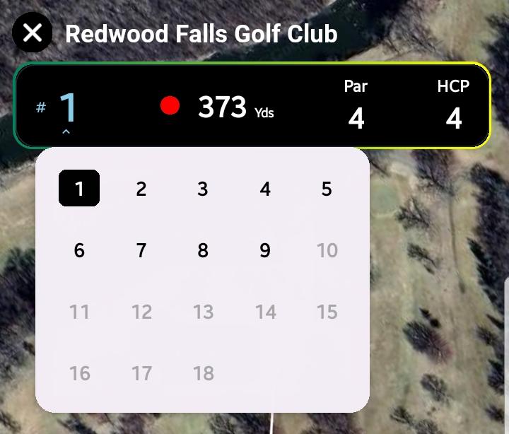 A dropdown to switch between holes 1 to 18. Selecting a hole repositions the map to that hole’s location. - Tee Marker Distance: