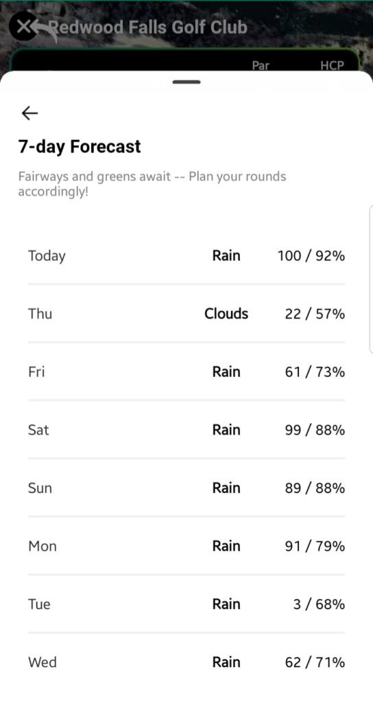 Opens a bottom sheet displaying a 7-day weather forecast, showing temperature and “rain / clouds percentage” data.