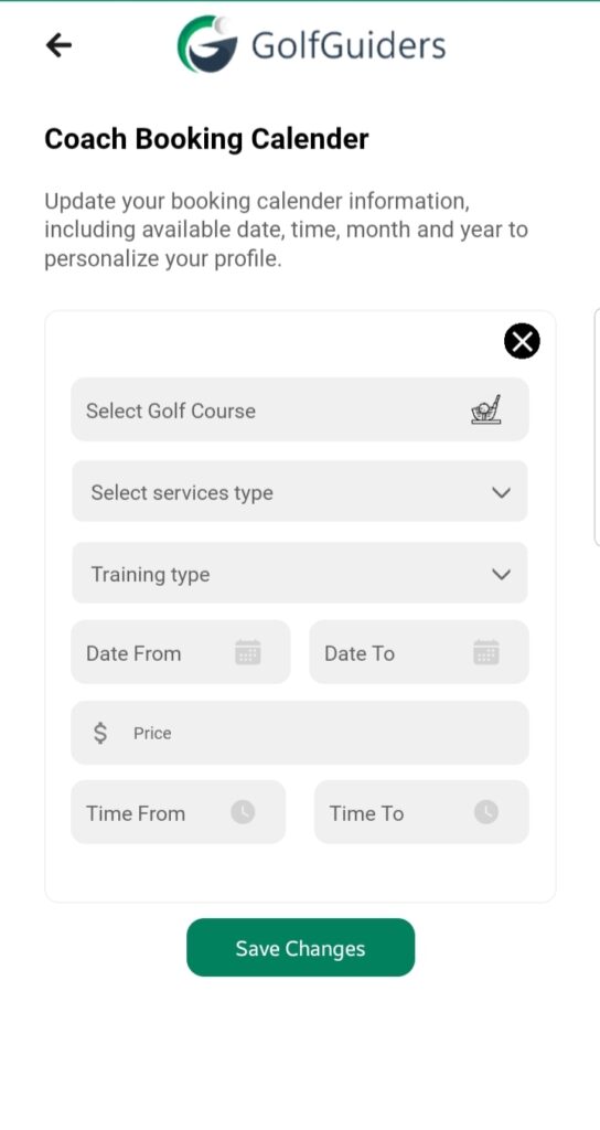 The Booking Calendar is a dedicated feature designed for coaches to manage and publish their session availability. It helps coaches define when, where, and how they are available for training, making it easier for golfers to request sessions that align with the coach’s schedule.