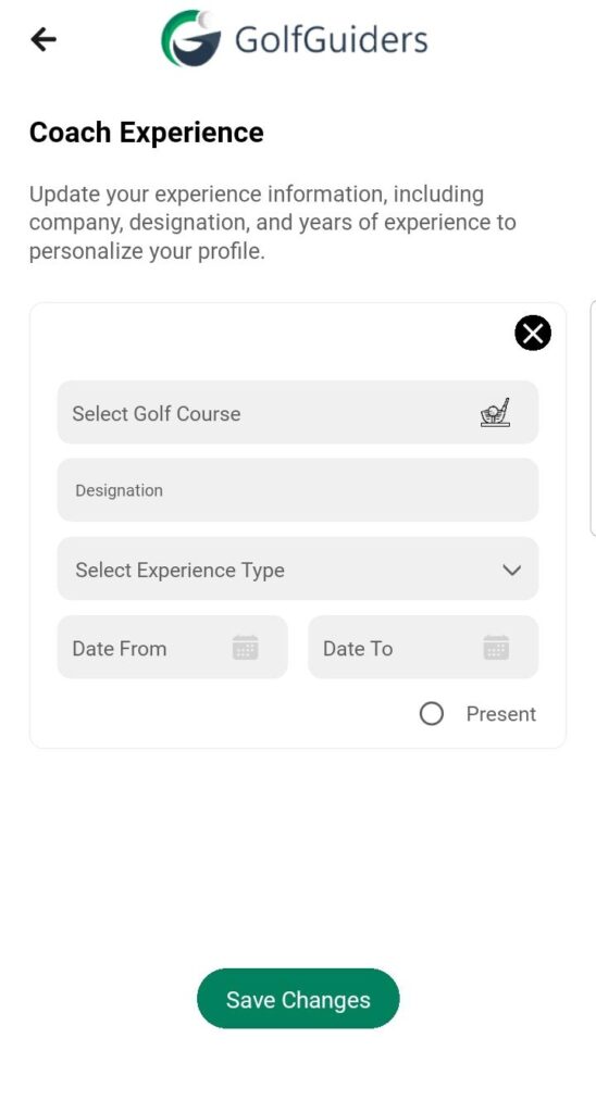 The Experience section is designed exclusively for coaches to showcase their professional background and associations with golf courses. Completing this section is essential for building credibility, enabling bookings, and linking services to verified locations.