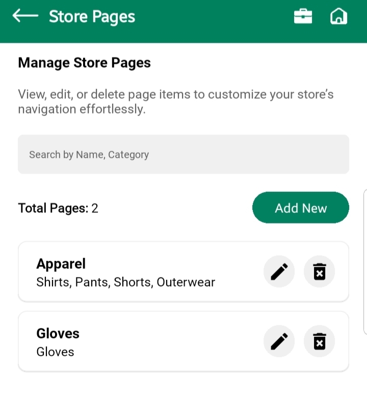 • On the Store Pages screen, use the pencil icon to update any page or category.