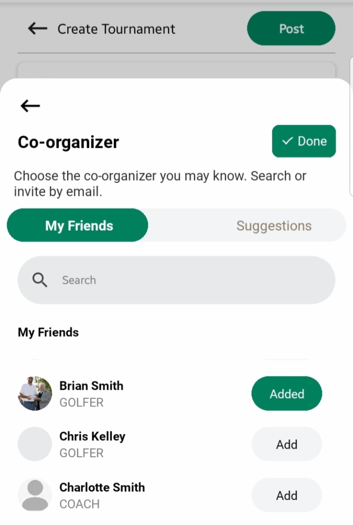 You can add co-organizers in your tournament, they almost do everything like organizer but they can’t edit or delete any tournament. Tap “Done“, after selecting all co-organizers to send them notification when posted