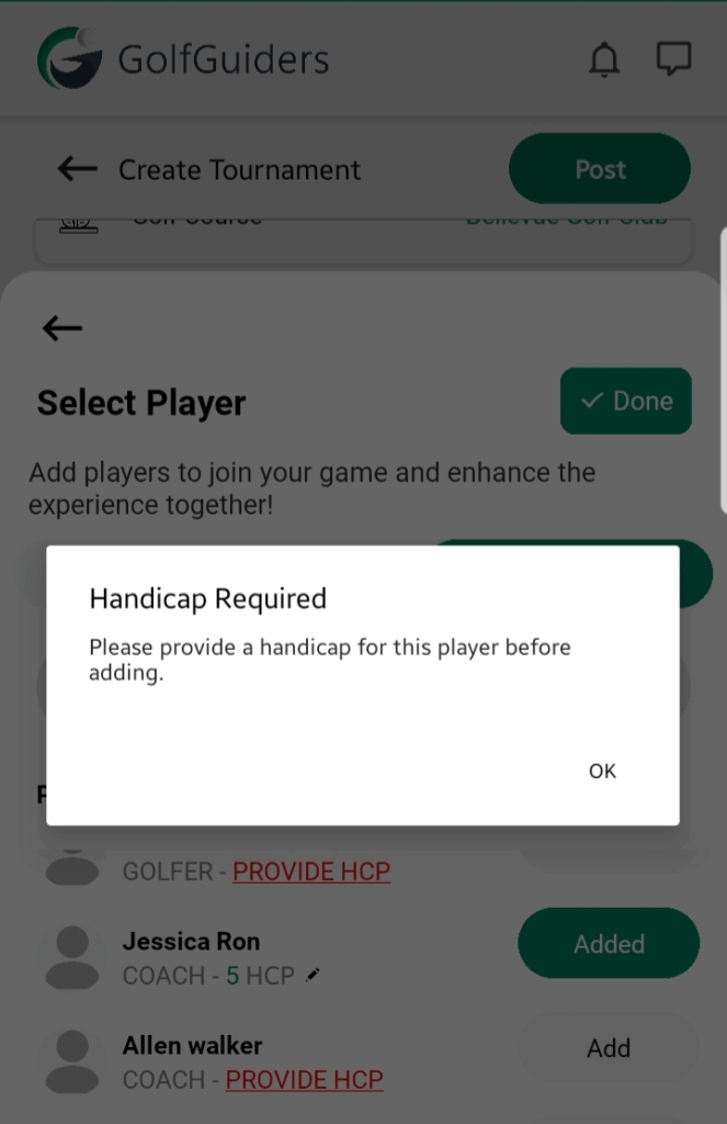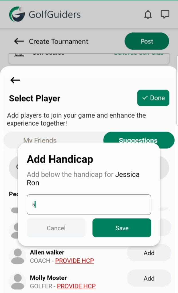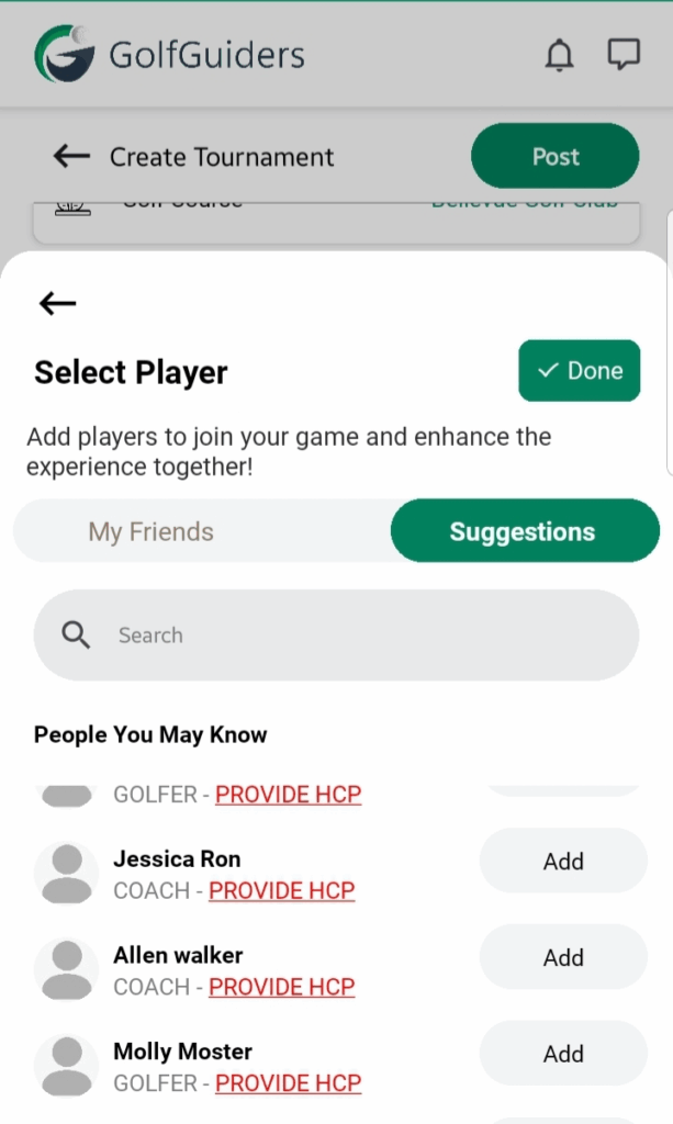 The Create Tournament feature allows any GolfGuider user — golfer, coach, or general member — to host a local tournament. The organizer can invite other users as Co-organizers or Players (whether they are friends or not). All invited participants receive both an in-app and email notification.
