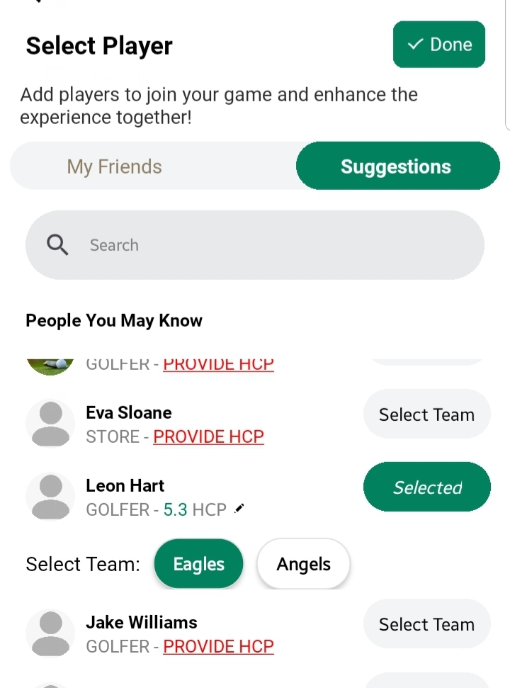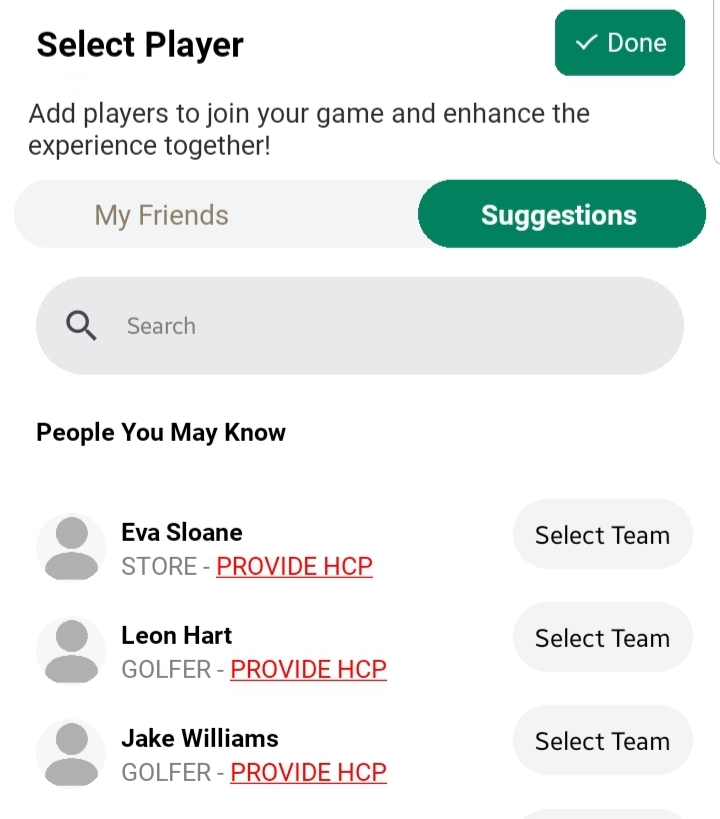 You can add players in your tournament individually as well as in teams (if available). Opens player selection sheet with Friends and Suggestions tabs.