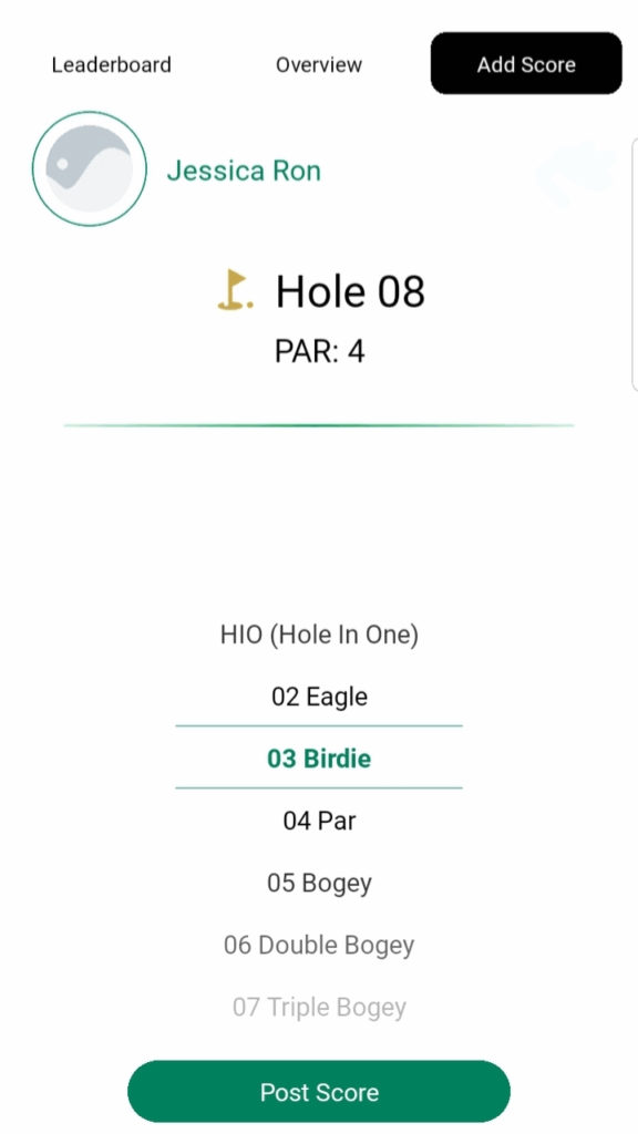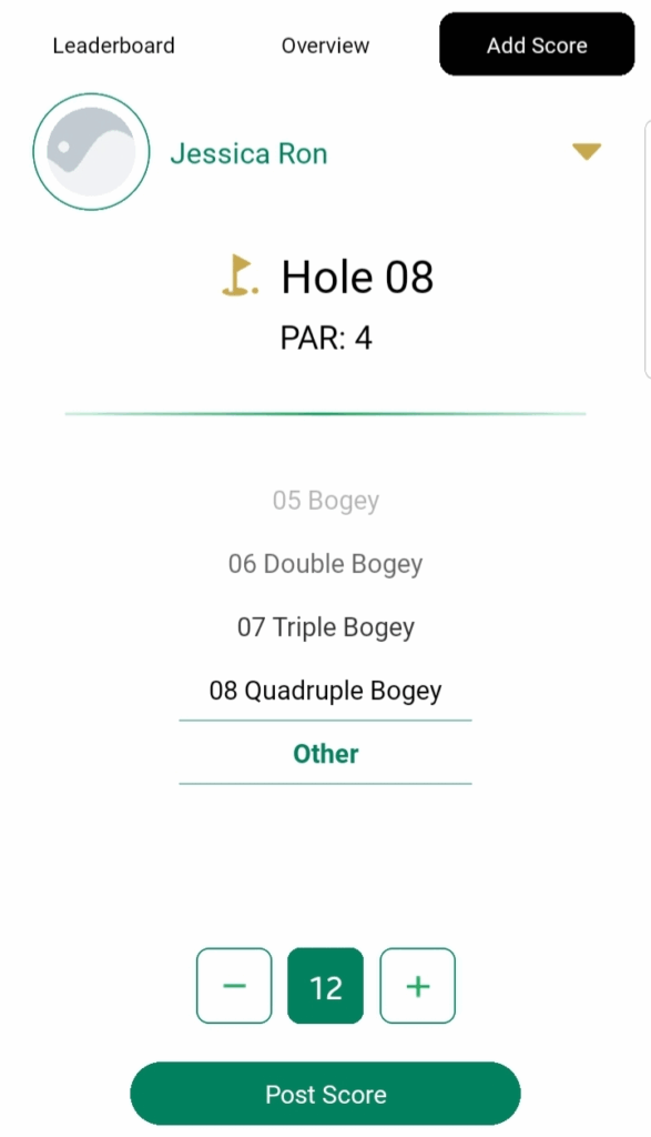 Users can tap on any of the available score values or scroll down to select a custom value (up to a maximum of 20). After choosing the score, they can tap Post Score to record it for the current hole and then proceed to the next hole.