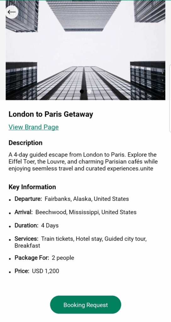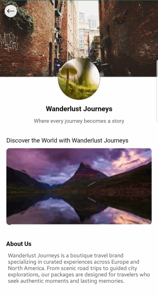 The Brand Page allows you to explore travel brands inside the app. Each brand presents its services, packages, and contact details in one place. This guide explains how you can interact with a Brand Page as a user.