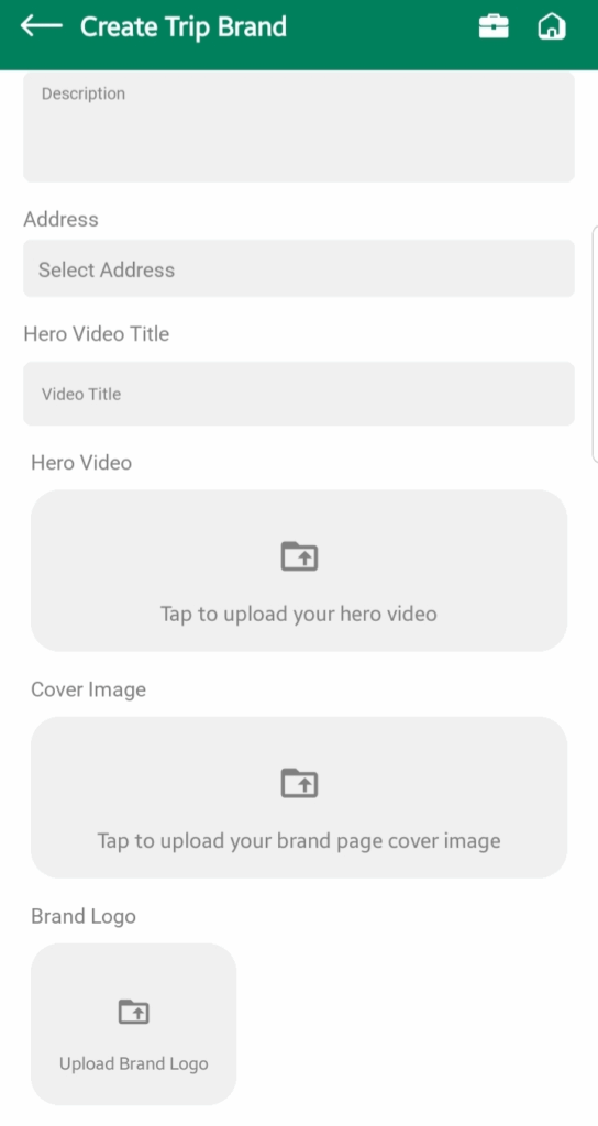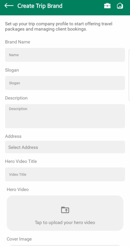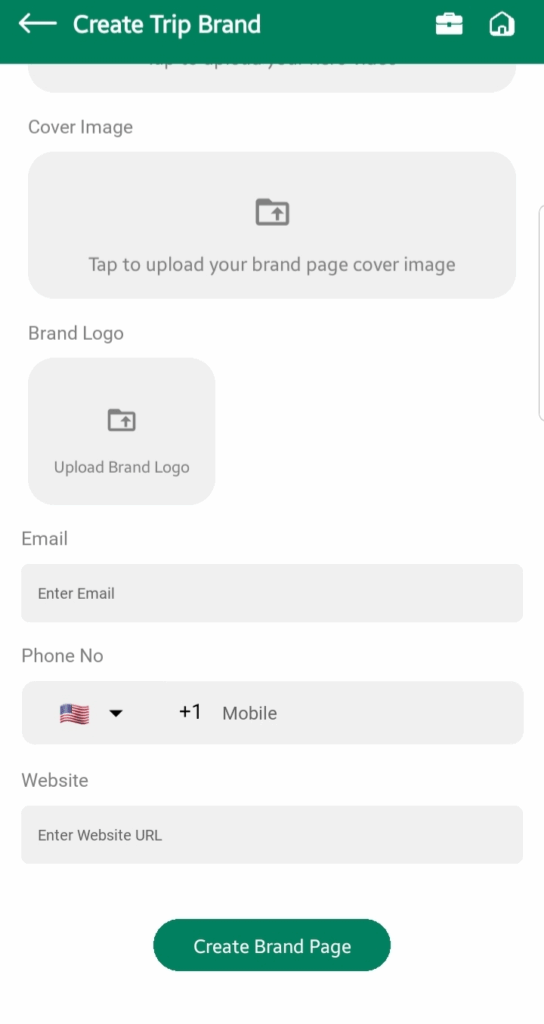 The Create Trip Brand feature allows you to build your own travel brand inside the app. Each user can create one brand only, which becomes your identity for showcasing trips and packages.
