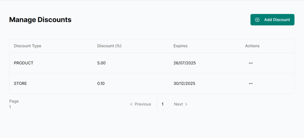 | Discount Type | Discount (%) | Expires On | Actions |