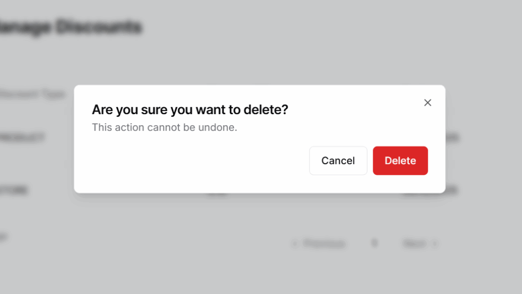 – Delete: Prompts a confirmation before removing the discount permanently.