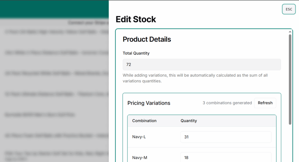 - For variation-based products, the total quantity is not shown in the table — manage quantity per variation via the edit drawer.