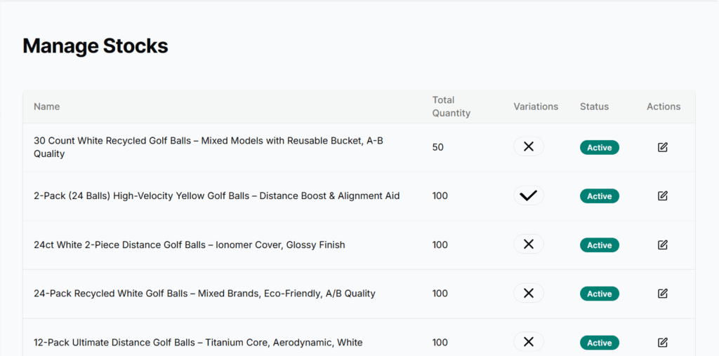 - Actions – A pencil icon is available for each product to update stock-related information.