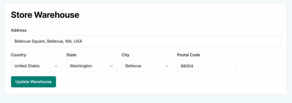 The Warehouse tab allows sellers to set the location of their store’s fulfillment center. This address is used for managing inventory, calculating shipping zones, and verifying store origin.