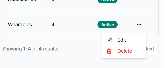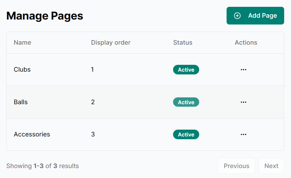 Each page listed in the table includes an actions menu (three-dot icon) in the final column. From here, you can choose to Edit or Delete a page.